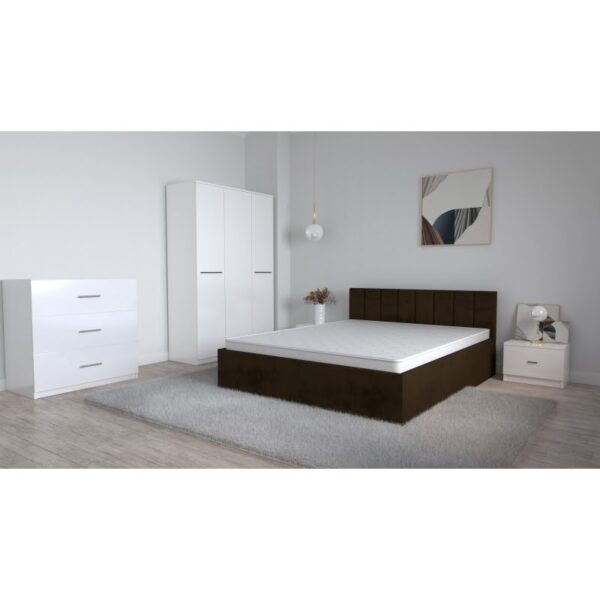 Set Dormitor Oliver Alb cu pat tapitat Maro inchis Dulap Lorena 4 usi Noptiere si Comoda TV 3 sertare