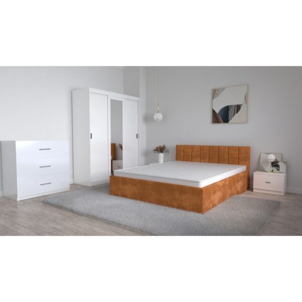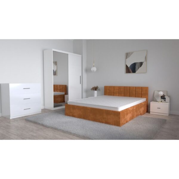 Set Dormitor Oliver Alb cu pat tapitat Caramiziu Dressing 2 usi glisante fara oglinda Noptiere si Comoda TV 3 sertare