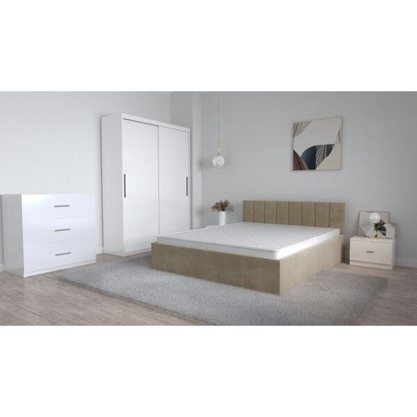 Set Dormitor Oliver Alb cu pat tapitat Bej stofa Dressing 2 usi glisante fara oglinda Noptiere si Comoda TV 3 sertare