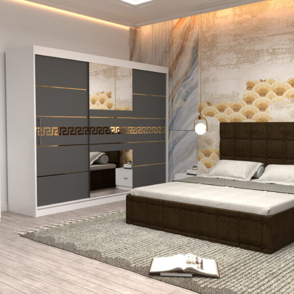 Dormitor Regal cu Pat Matrimonial Maro Stofa Dulap Gold usi glisante 250 x 200 cm Alb cu usi Gri cu Oglinda Noptiere si comoda TV