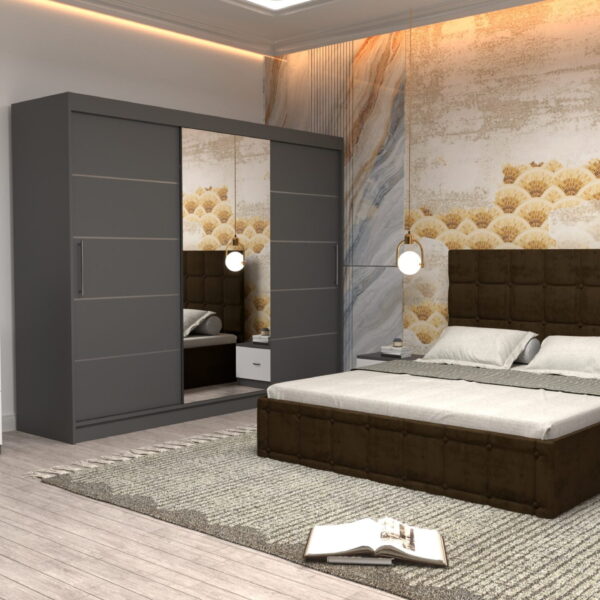 Dormitor Regal cu Pat Matrimonial Maro Stofa Dulap usi glisante 250 x 200 cm Gri cu usi Gri Cu Oglinda si Noptiere comoda TV