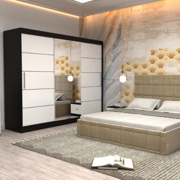 Dormitor Regal cu Pat Matrimonial Bej Stofa Dulap usi glisante 250 x 200 cm Wenghe cu usi Albe Cu Oglinda Noptiere si comoda TV