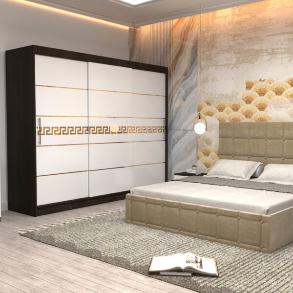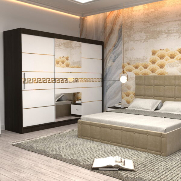 Dormitor Regal cu Pat Matrimonial Bej Stofa Dulap Gold usi glisante 250 x 200 cm Wenghe cu usi Albe Cu Oglinda Noptiere si comoda TV