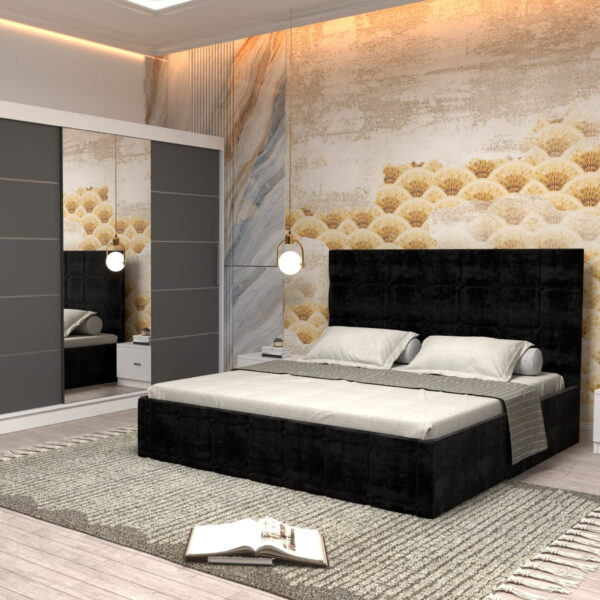 Dormitor Regal cu Pat Matrimonial Negru Stofa Dulap usi glisante 250 x 200 cm Alb cu usi Gri cu Oglinda Noptiere si comoda TV