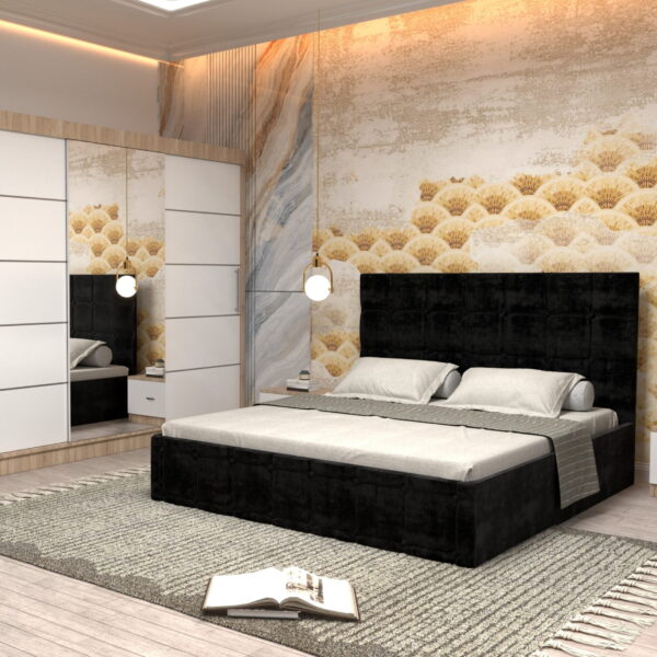Dormitor Regal cu Pat Matrimonial Negru Stofa Dulap usi glisante 250 x 200 cm Alb cu usi Albe Cu Oglinda Noptiere si comoda TV
