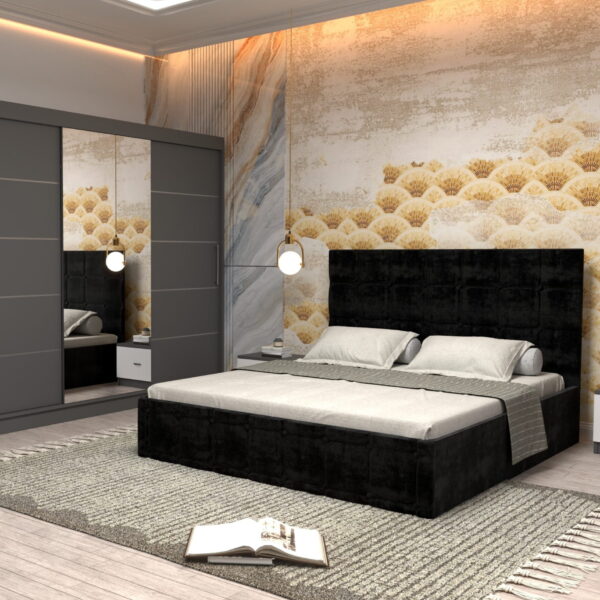 Dormitor Regal cu Pat Matrimonial Negru Stofa Dulap usi glisante 200 x 200 cm Wenghe cu usi Gri Fara Oglinda si Noptiere