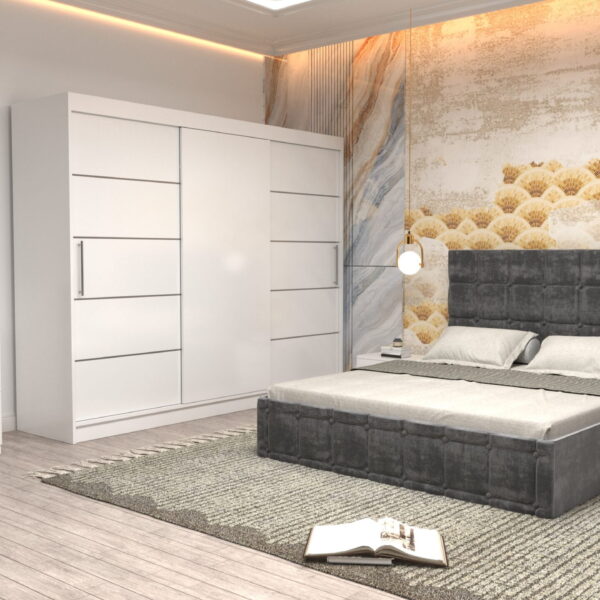 Dormitor Regal cu Pat Matrimonial Gri Stofa Dulap usi glisante 250 x 200 cm Alb cu usi Albe Fara Oglinda Noptiere si comoda TV