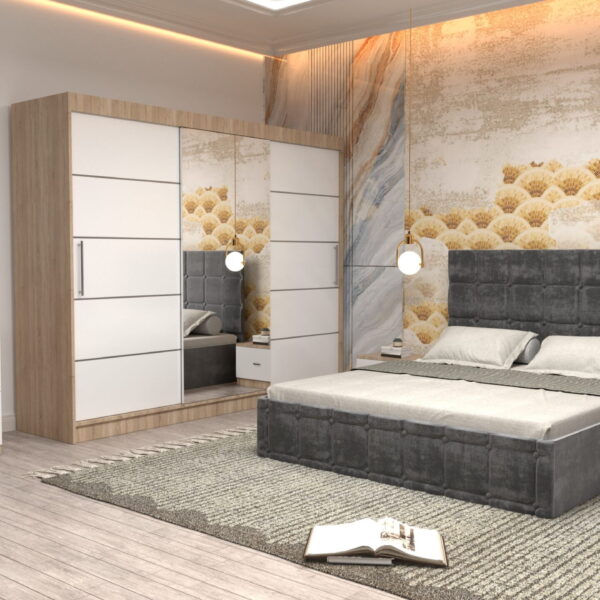 Dormitor Regal cu Pat Matrimonial Gri Stofa Dulap usi glisante 250 x 200 cm Sonoma cu usi Albe Cu Oglinda Noptiere si comoda TV