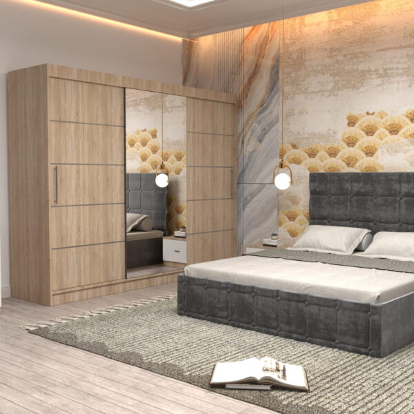Dormitor Regal cu Pat Matrimonial Gri Stofa Dulap usi glisante 250 x 200 cm Gri cu usi Gri Cu Oglinda si Noptiere comoda TV
