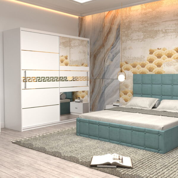 Dormitor Regal cu Pat Matrimonial Turcoaz Stofa Dulap Gold usi glisante 200 x 200 cm Alb cu usi Albe Cu Oglinda Noptiere si comoda TV