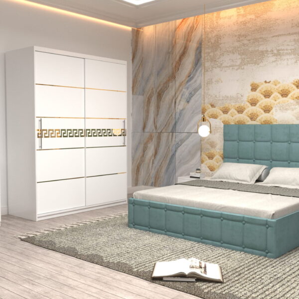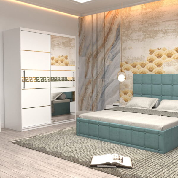 Dormitor Regal cu Pat Matrimonial Turcoaz Stofa Dulap Gold usi glisante 150 x 200 cm Alb cu usi Albe Cu Oglinda Noptiere si comoda TV