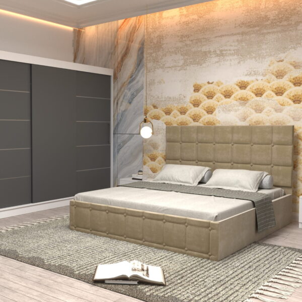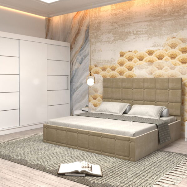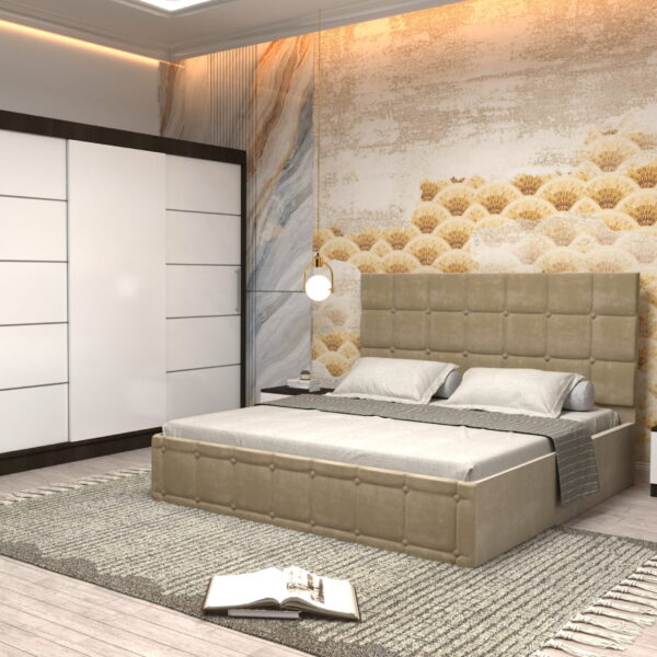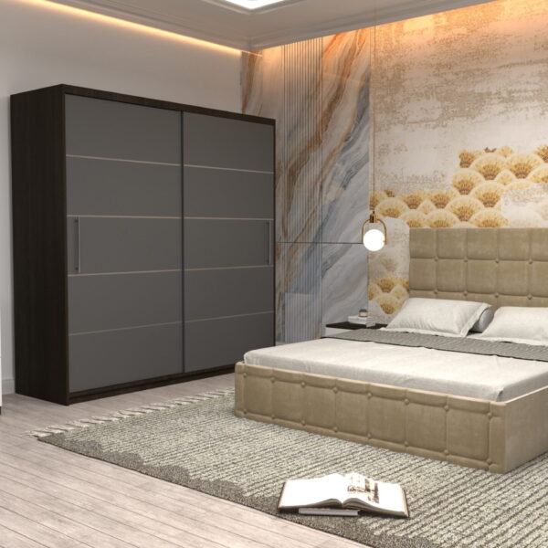 Dormitor Regal cu Pat Matrimonial Bej Stofa Dulap usi glisante 200 x 200 cm Wenghe cu usi Gri Fara Oglinda Noptiere si comoda TV