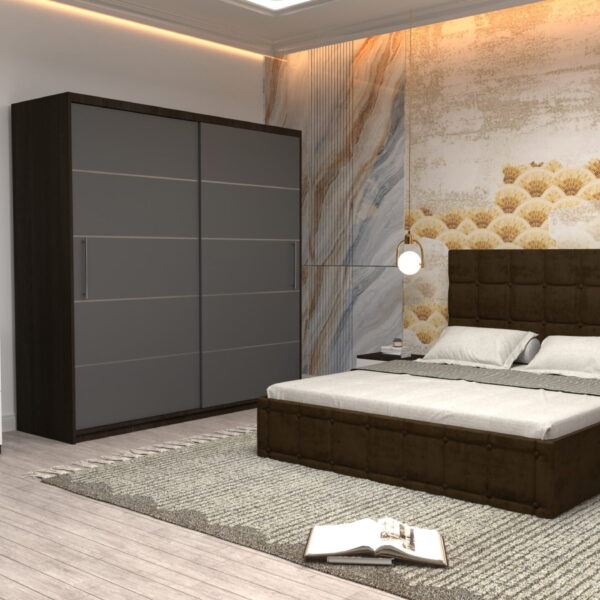 Dormitor Regal cu Pat Matrimonial Maro Stofa Dulap usi glisante 200 x 200 cm Wenghe cu usi Gri Fara Oglinda Noptiere si comoda TV