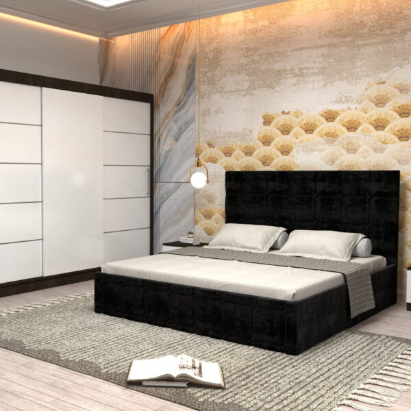 Dormitor Regal cu Pat Matrimonial Negru Stofa Dulap usi glisante 250 x 200 cm Alb cu usi Albe Fara Oglinda si Noptiere