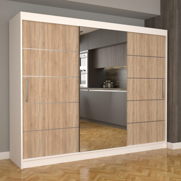 Dulap Dormitor Nova Plus 250 cm x 200 cm , cu oglinda , Alb cu usi glisante Sonoma