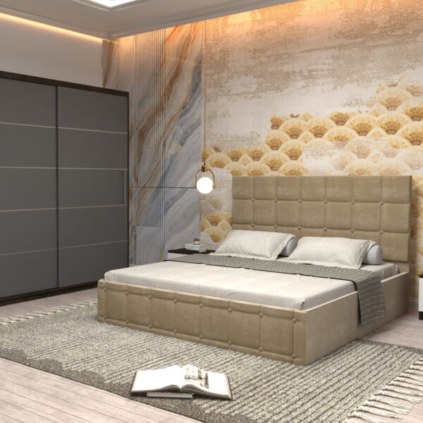 Dormitor Regal cu Pat Matrimonial Bej Stofa Dulap usi glisante 200 x 200 cm Wenghe cu usi Gri Fara Oglinda si Noptiere