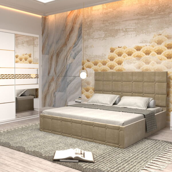 Dormitor Regal cu Pat Matrimonial Bej Stofa Dulap Gold usi glisante 150 x 200 cm Alb cu usi Albe Cu Oglinda si Noptiere