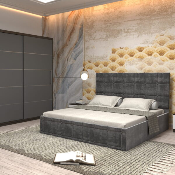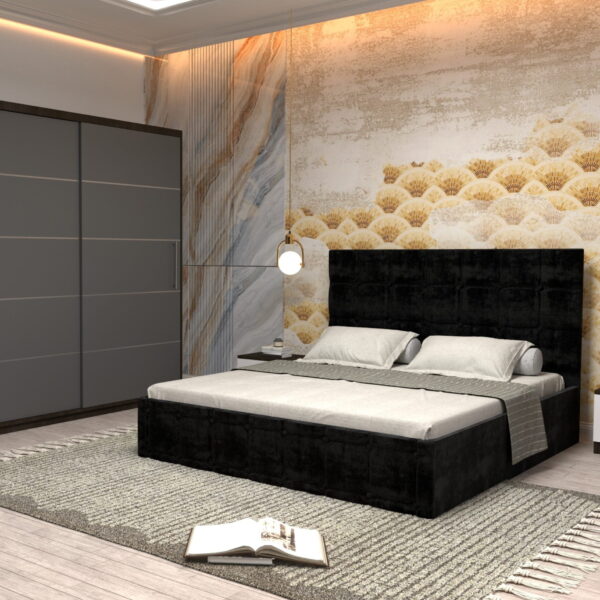 Dormitor Regal cu Pat Matrimonial Negru Stofa Dulap usi glisante 200 x 200 cm Wenghe cu usi Gri Fara Oglinda si Noptiere