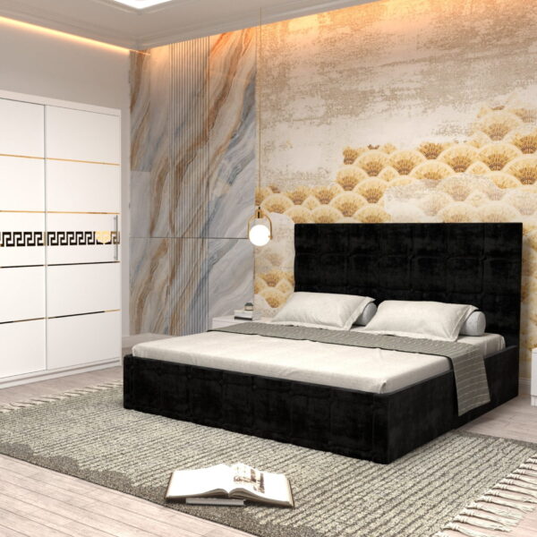 Dormitor Regal cu Pat Matrimonial Negru Stofa Dulap Gold usi glisante 150 x 200 cm Alb cu usi Albe Fara Oglinda si Noptiere