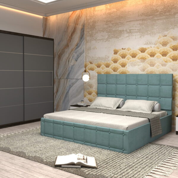 Dormitor Regal cu Pat Matrimonial Turcoaz Stofa Dulap usi glisante 200 x 200 cm Wenghe cu usi Gri Fara Oglinda si Noptiere