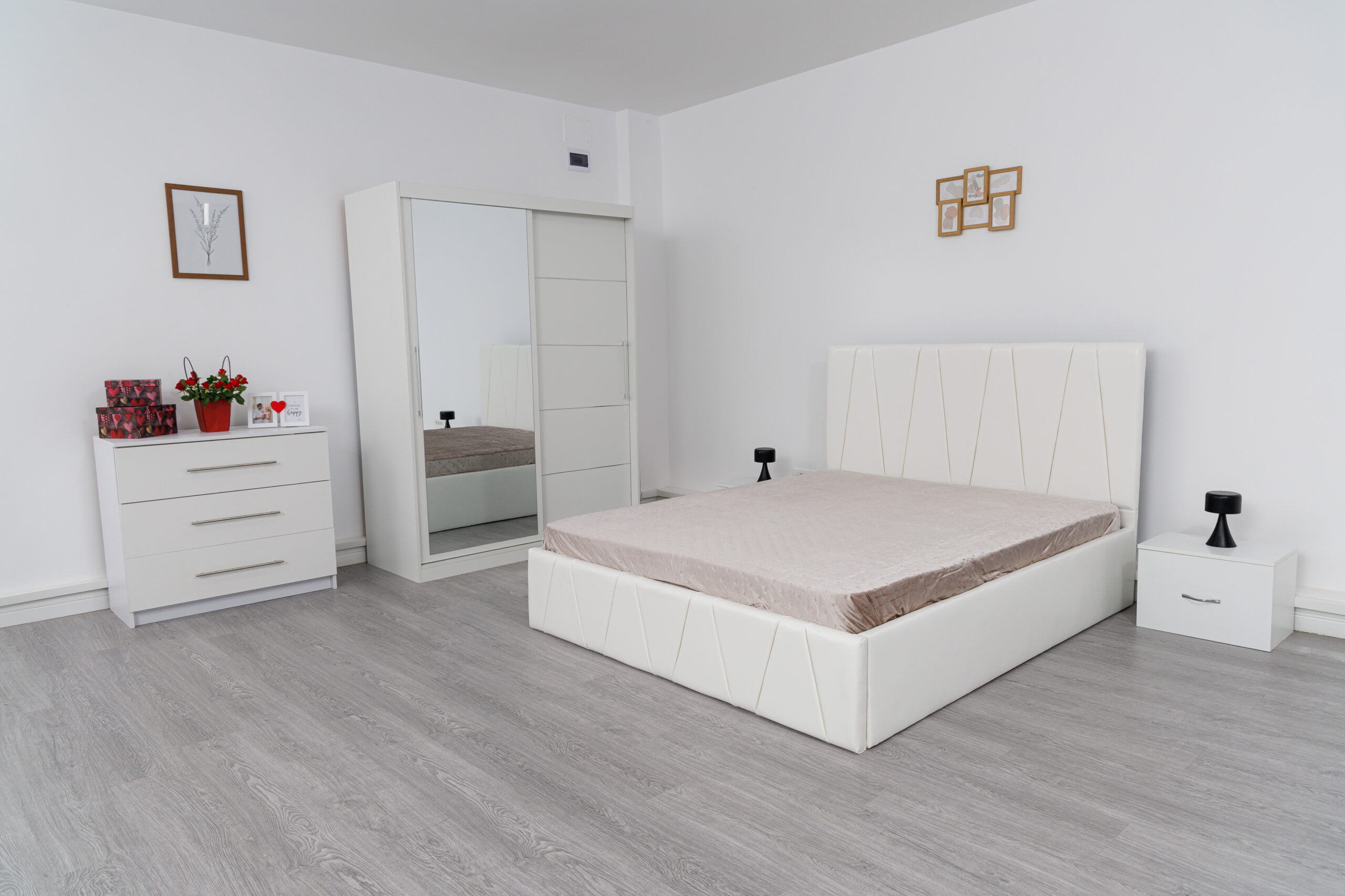 Dormitor Eric Alb cu Pat Tapitat Alb Piele Dulap Usi Glisante 150 x 200 cm Alb cu oglinda Noptiere si Comoda TV