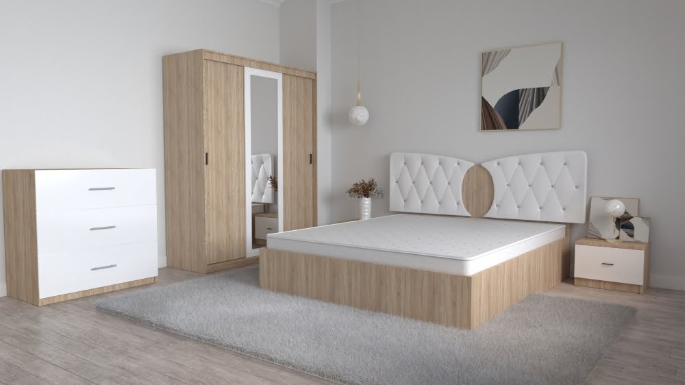 Dormitor Kent Sonoma Alb cu Pat Matrimonial 160 cm x 200 cm Dulap 3 Usi Glisante cu Oglinda Noptiere si Comoda Tv 3 sertare