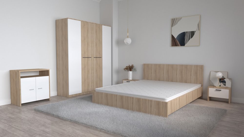 Dormitor, Lorena, Sonoma Alb, Pat Matrimonial, Dulap Lorena, 4 usi, Noptiere, comoda Tv Lorena, mobilier, dormitor, pat, dulap, noptiere, comoda, tv