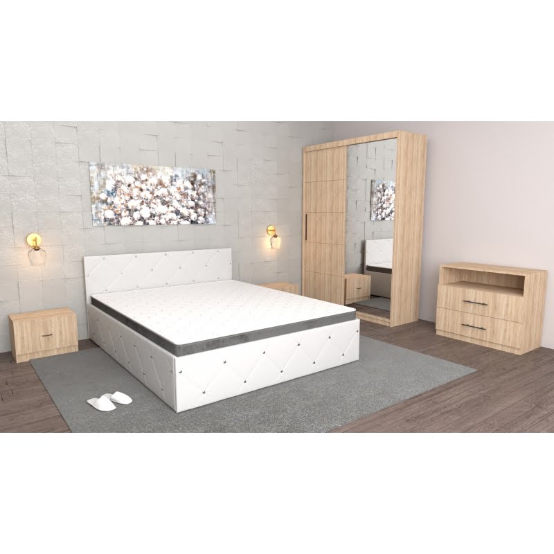 Dormitor Milano Sonoma Alb cu comoda Tv Sonoma, Dulap usi glisante cu oglinda, Pat Matrimonial Alb si Noptiere Sonoma