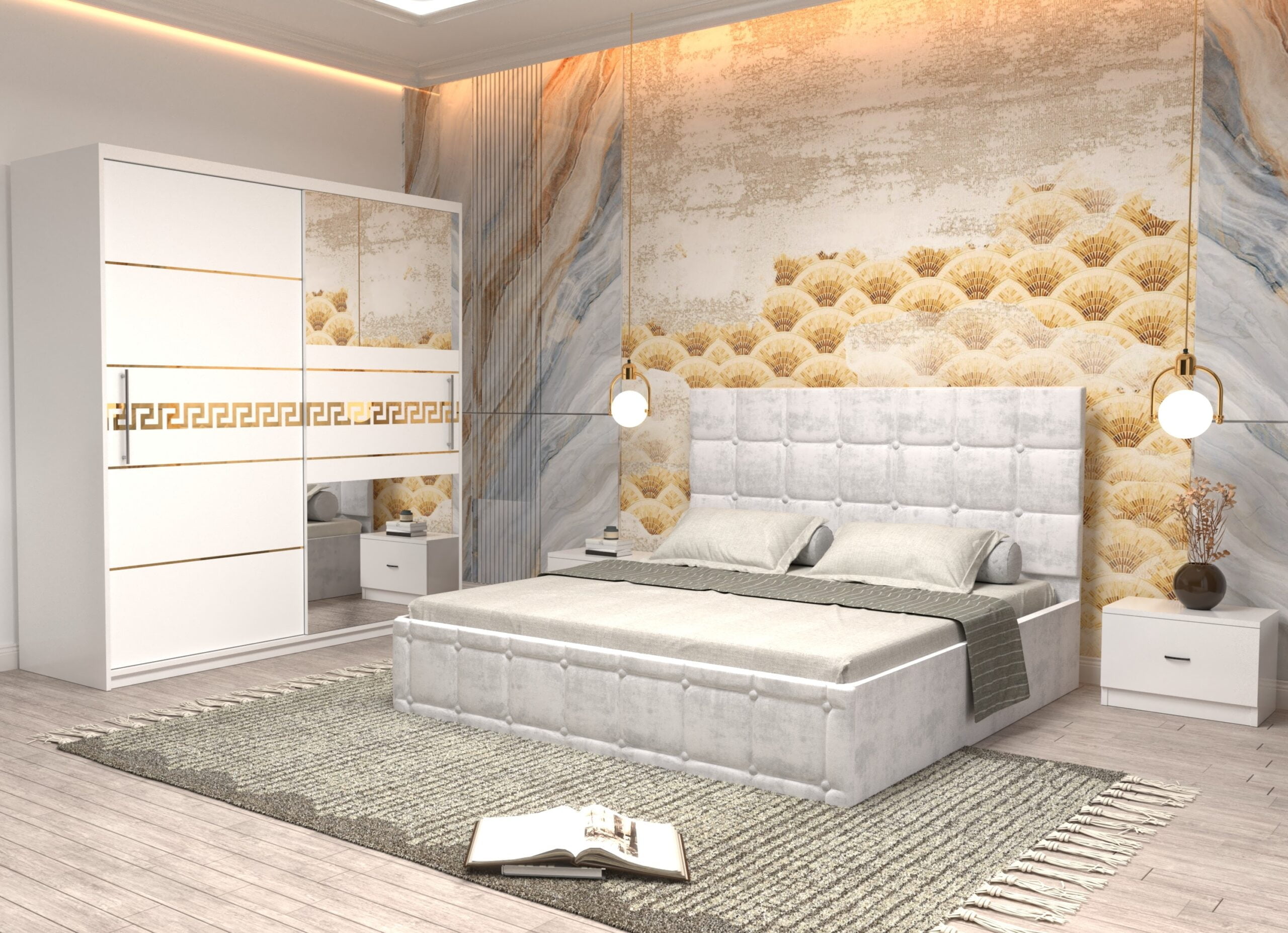Dormitor Regal cu Pat Matrimonial Alb Stofa Dulap Gold usi glisante 200 x 200 cm Alb cu usi glisante Albe Cu Oglinda si Noptiere