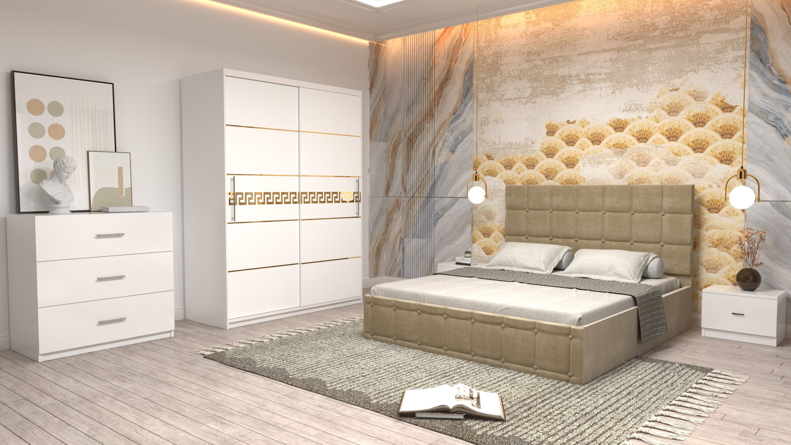 Dormitor Regal cu Pat Matrimonial Bej Stofa Dulap Gold usi glisante 150 x 200 cm Alb cu usi Albe Fara Oglinda Noptiere si comoda TV