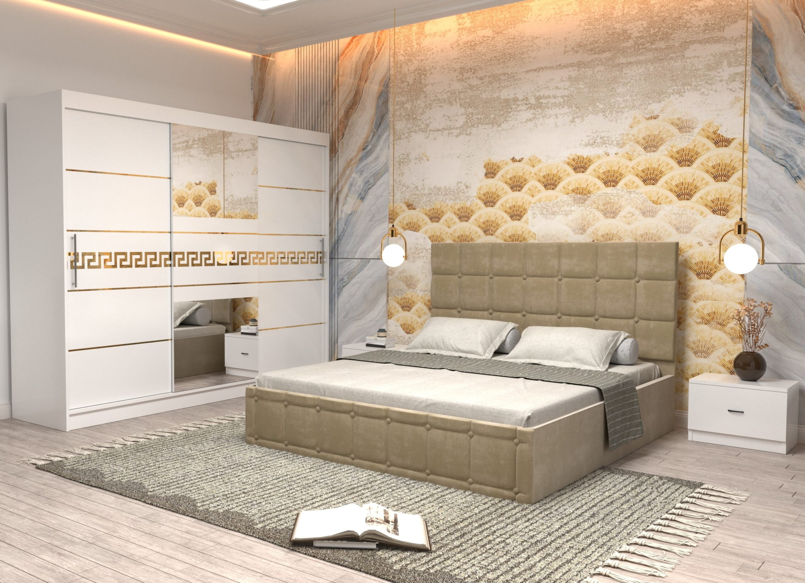 Dormitor Regal cu Pat Matrimonial Bej Stofa Dulap Gold usi glisante 250 x 200 cm Alb cu usi Albe Cu Oglinda si Noptiere