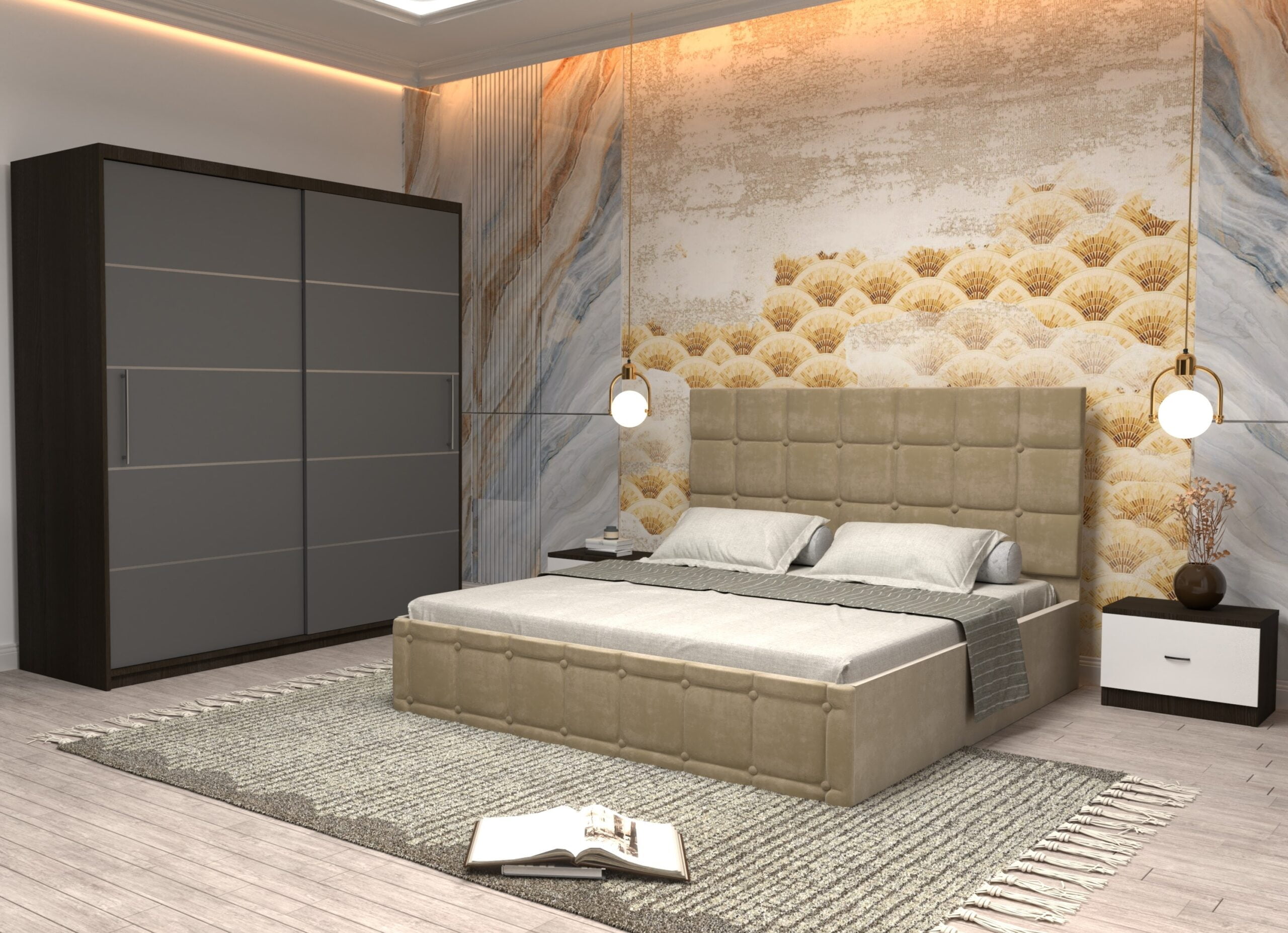 Dormitor Regal cu Pat Matrimonial Bej Stofa Dulap usi glisante 200 x 200 cm Wenghe cu usi Gri Fara Oglinda si Noptiere