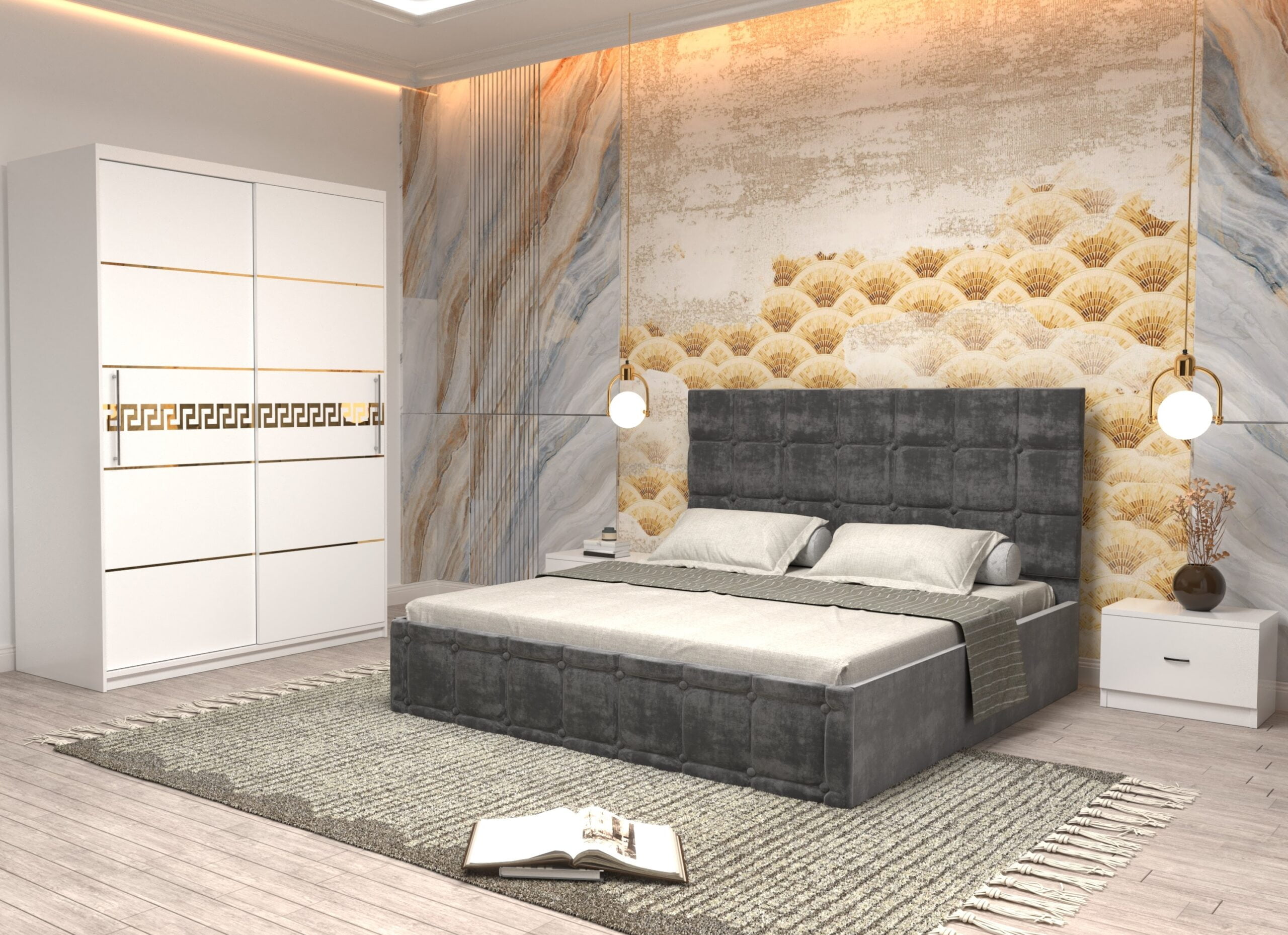 Dormitor Regal cu Pat Matrimonial Gri Stofa Dulap Gold usi glisante 150 x 200 cm Alb cu usi Albe Fara Oglinda si Noptiere
