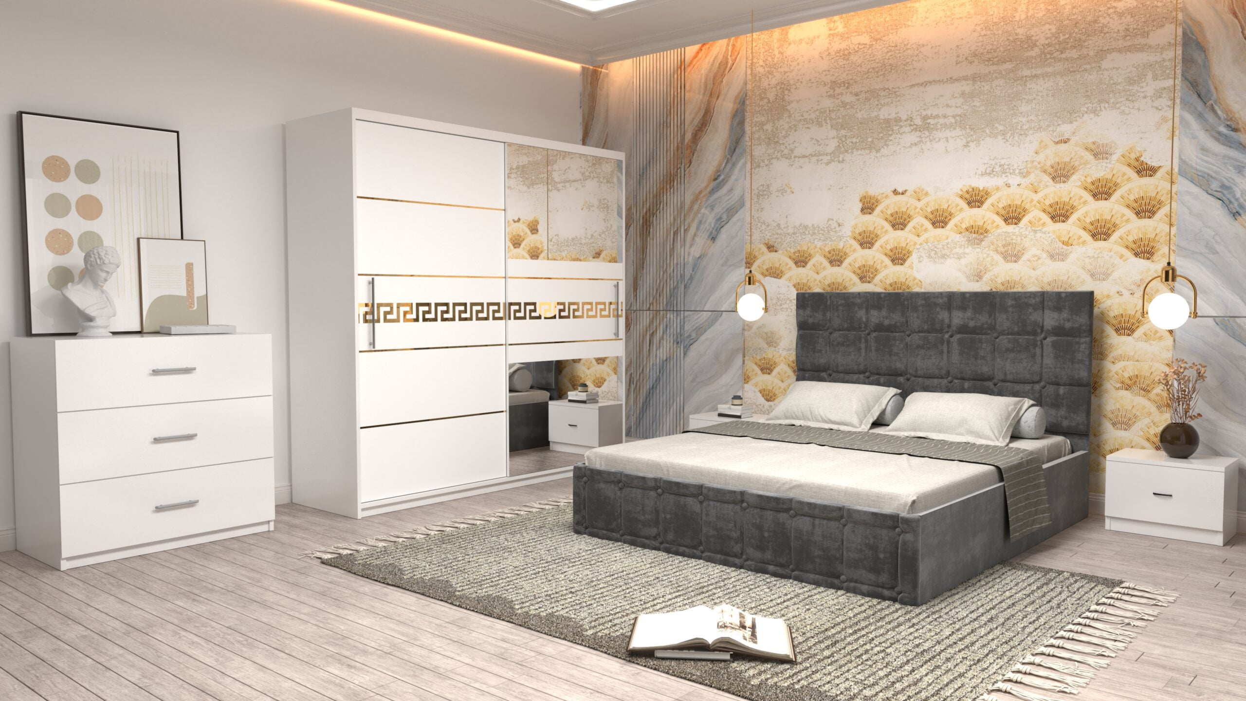 Dormitor Regal cu Pat Matrimonial Gri Stofa Dulap Gold usi glisante 200 x 200 cm Alb cu usi Albe Cu Oglinda Noptiere si comoda TV