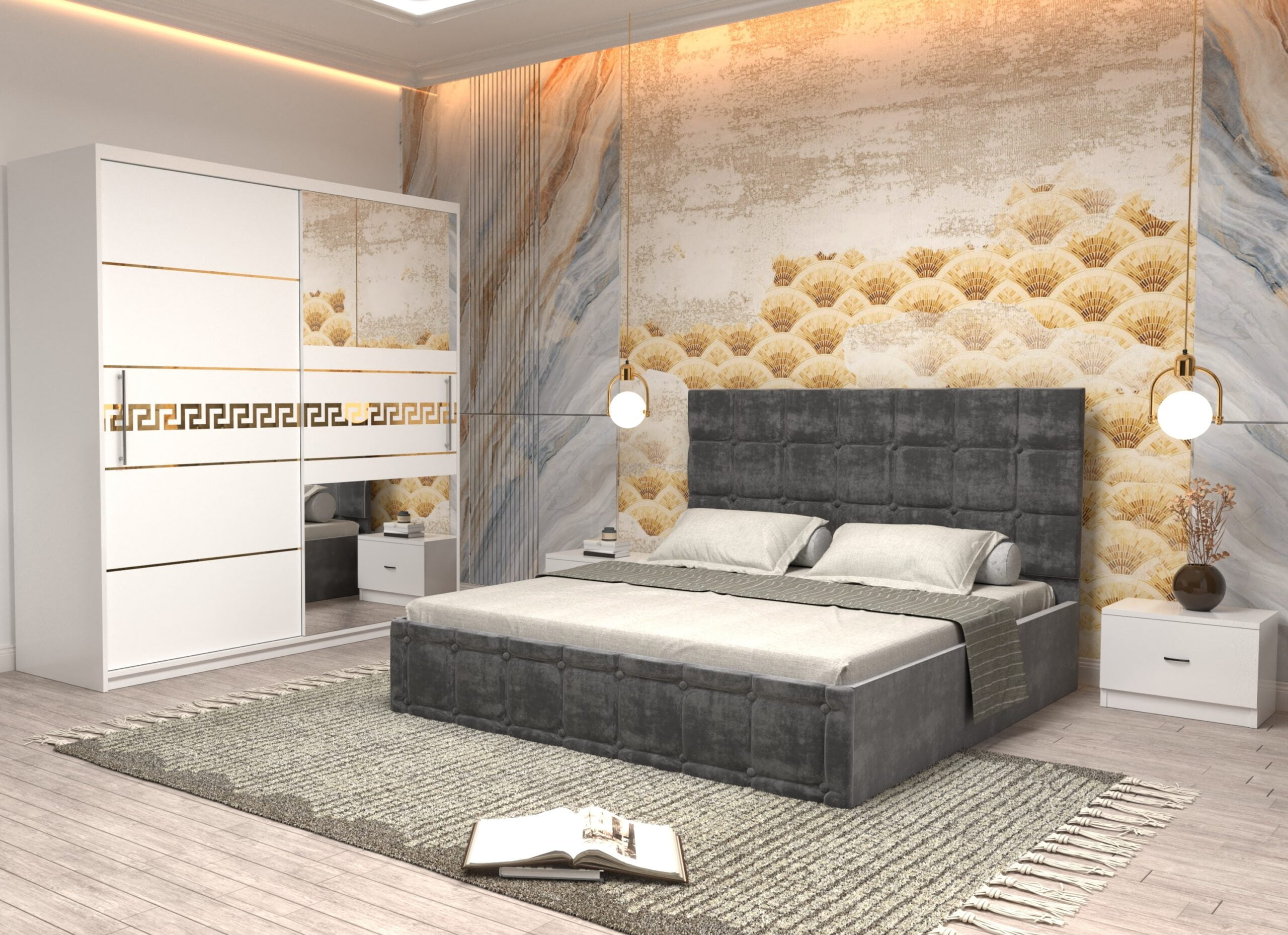 Dormitor Regal cu Pat Matrimonial Gri Stofa Dulap Gold usi glisante 200 x 200 cm Alb cu usi Albe Cu Oglinda si Noptiere