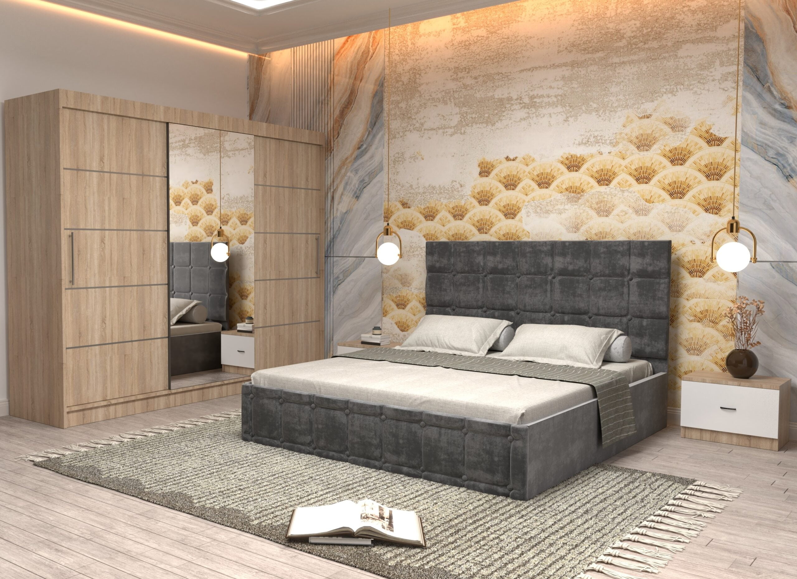 Dormitor Regal cu Pat Matrimonial Gri Stofa Dulap usi glisante 250 x 200 cm Sonoma cu usi Sonoma Cu Oglinda si Noptiere