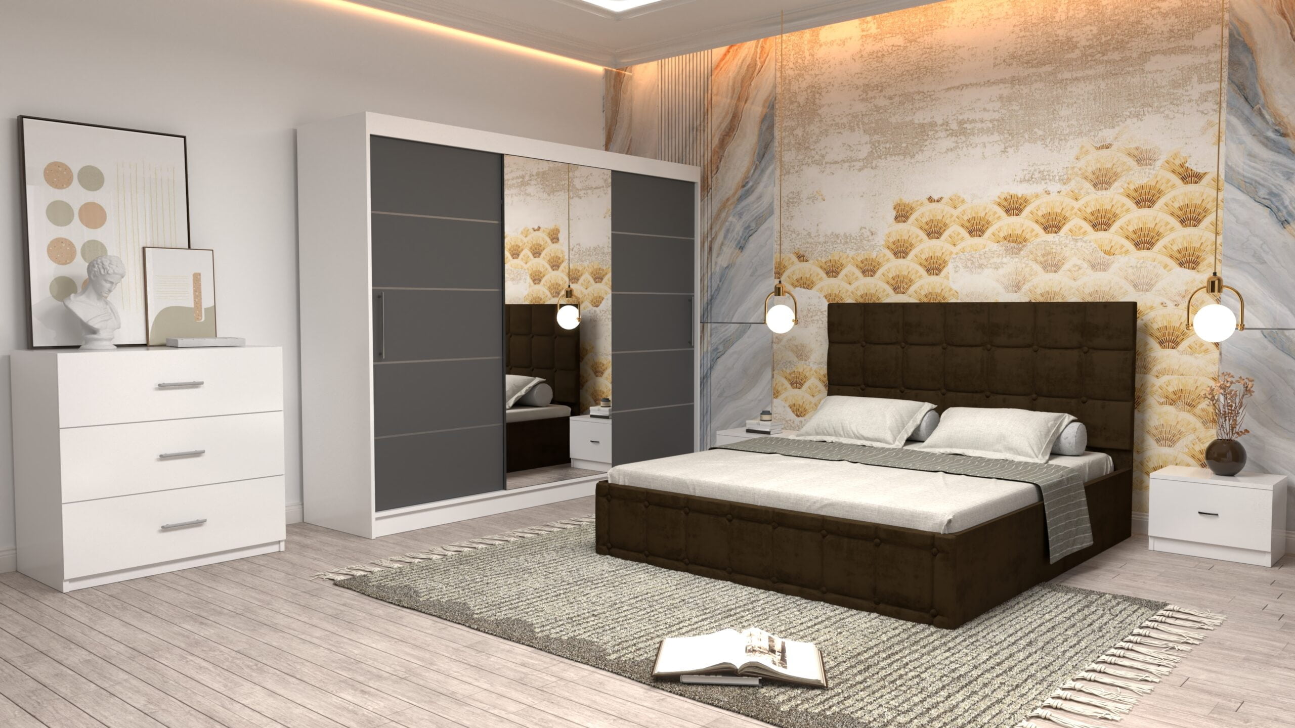 Dormitor Regal cu Pat Matrimonial Maro Stofa Dulap usi glisante 250 x 200 cm Alb cu usi Gri cu Oglinda Noptiere si comoda TV