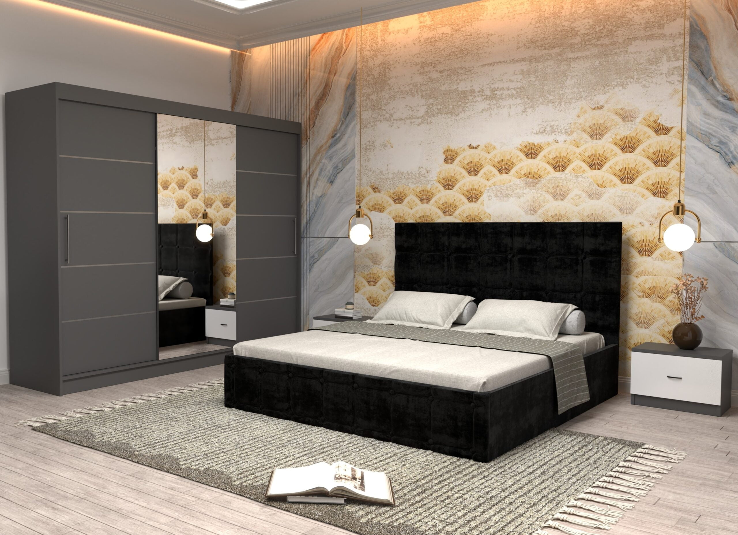 Dormitor Regal cu Pat Matrimonial Negru Stofa Dulap usi glisante 250 x 200 cm Gri cu usi Gri Cu Oglinda si Noptiere