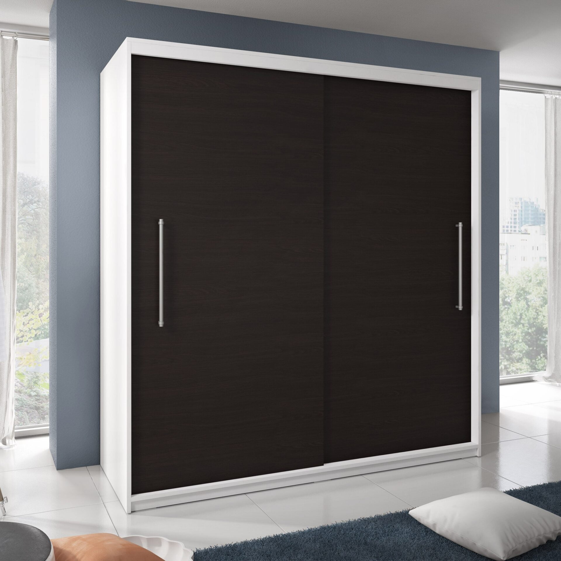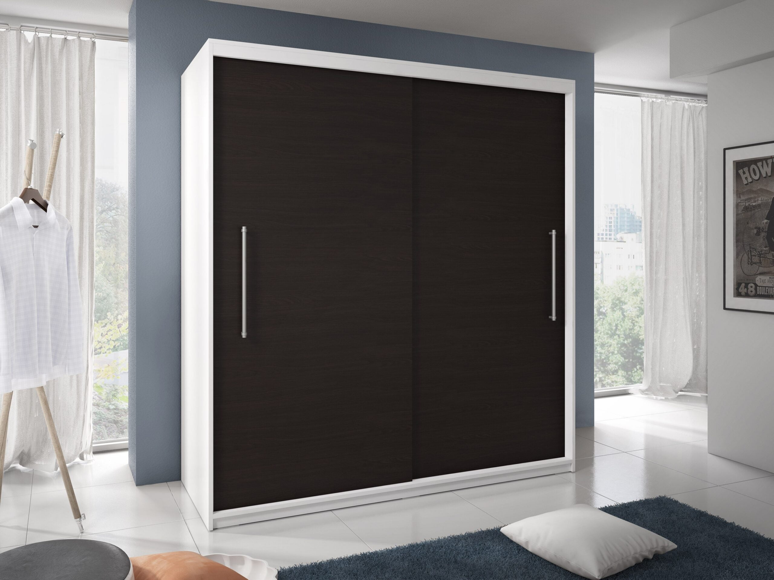 Dressing-ul Sebastian 200 cm alb cu usi glisante wenge, simplu si modern, cu usi glisante din sticla, organizeaza eficient hainele si accesoriile.