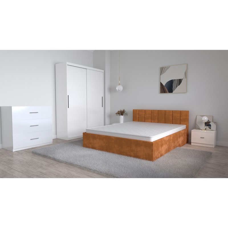 Set Dormitor Oliver Alb cu pat tapitat Caramiziu Dressing 2 usi glisante fara oglinda Noptiere si Comoda TV 3 sertare