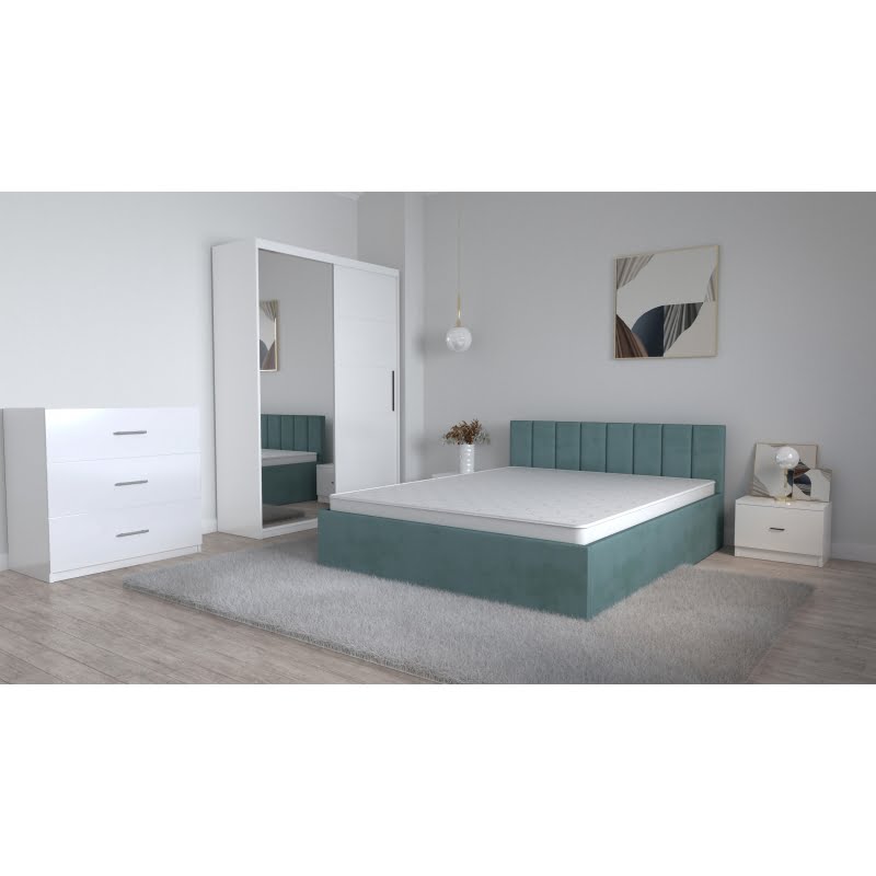 Set Dormitor Oliver Alb cu Pat Tapitat Turcoaz Dressing 2 usi glisante cu oglinda Noptiere si comoda Tv 3 sertare – Setul de dormitor Oliver Alb cu pat tapitat turcoaz, dressing cu 2 usi glisante cu oglinda, noptiere si comoda TV cu 3 sertare.