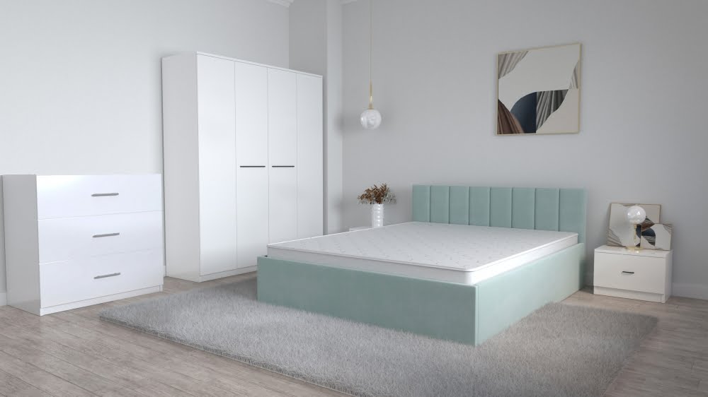 Set Dormitor Oliver Alb cu Pat Tapitat Vernil Stofa Dulap Lorena 4 usi Noptiere si comoda Tv 3 sertare – Setul de dormitor Oliver Alb cu pat tapitat Vernil Stofa, dulap Lorena cu 4 usi, noptiere si comoda TV cu 3 sertare.