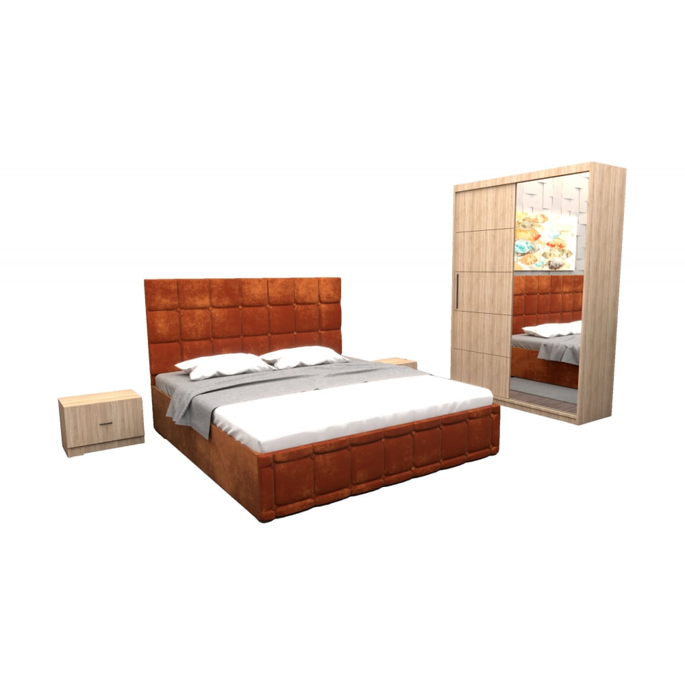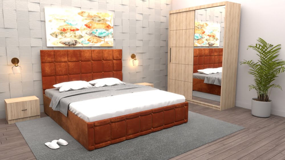 Set Dormitor Regal cu Pat Tapitat Caramiziu stofa cu dulap usi glisante Sonoma cu oglinda si fara comoda Tv