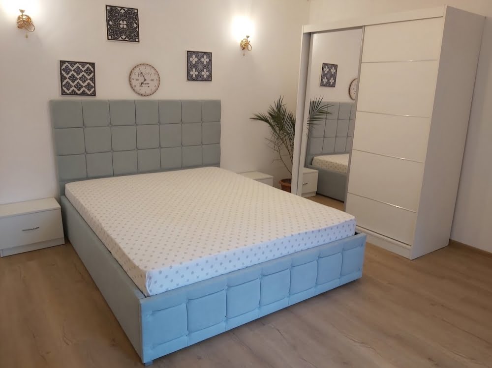 Fii primul care scrii o recenzie pentru „Set Dormitor Regal cu Pat Tapitat Vernil din stofa Dulap Gabriel 2 usi glisante cu oglinda”