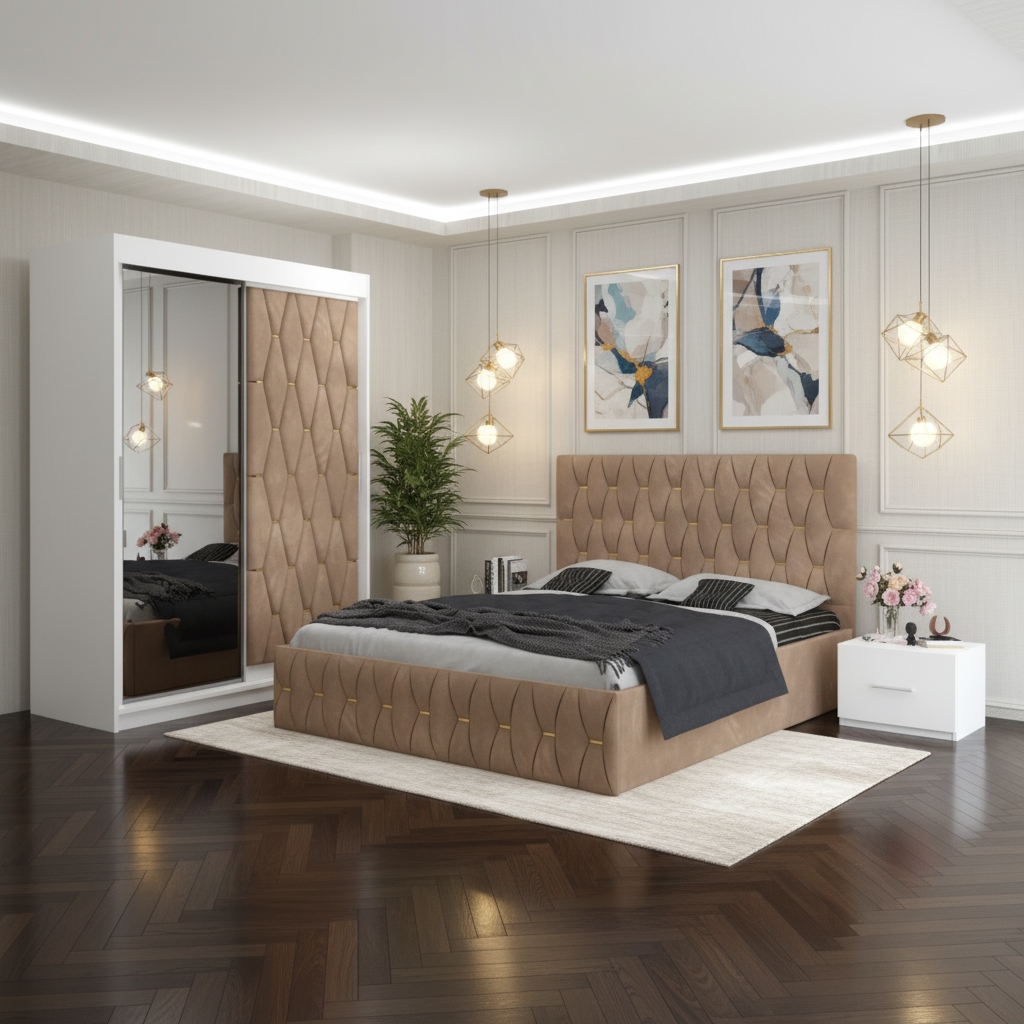 Dormitor Iris Crem cu Dressing Tapitat si 2 Noptiere