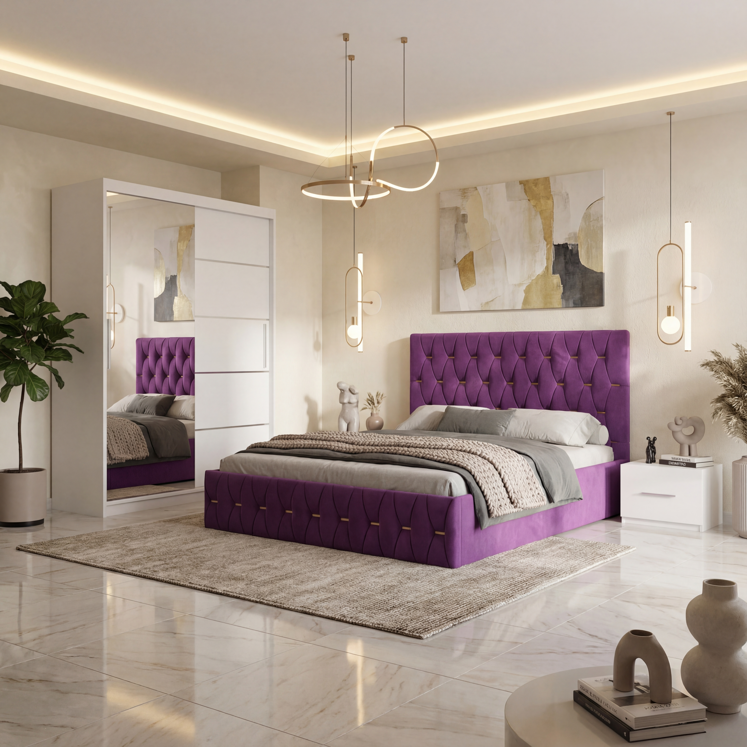 Dormitor Iris Mov cu Pat Tapitat , Dresing 150 si Noptiere