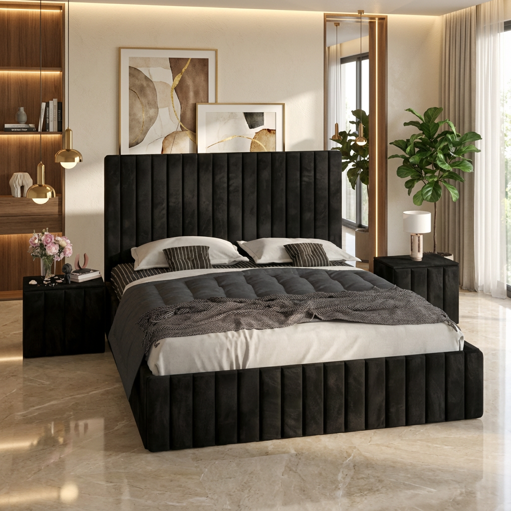 Pat Adela Negru Catifea Premium Cu Noptiere Tapitate