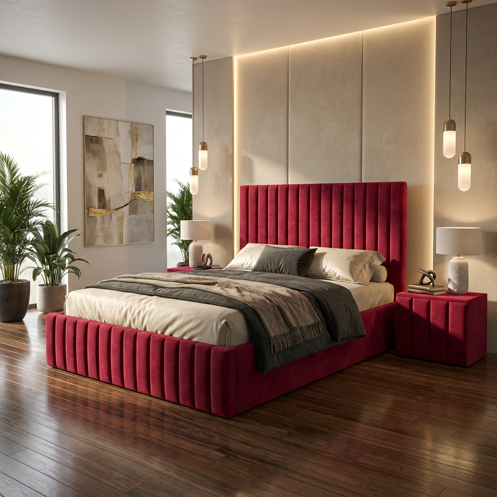 Pat Adela Visiniu Catifea Premium cu Noptiere Tapitate