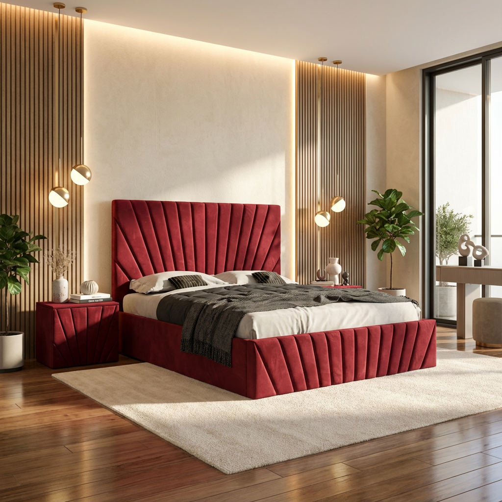 Pat Tapitat Leon Visiniu Catifea Premium Cu Noptiere Tapitate