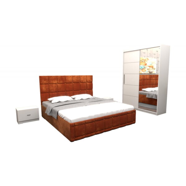 Set Dormitor Regal cu Pat Tapitat Caramiziu stofa cu dulap usi glisante Alb cu oglinda si fara comoda Tv